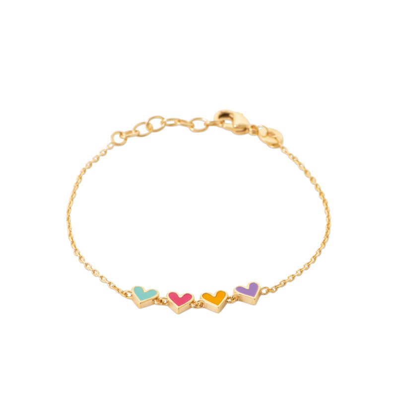 Цветна позлатена гривна с емайлирани сърчица в нежни тонове — символ на любов и радост. Идеален аксесоар за настроение или подарък за любим човек.