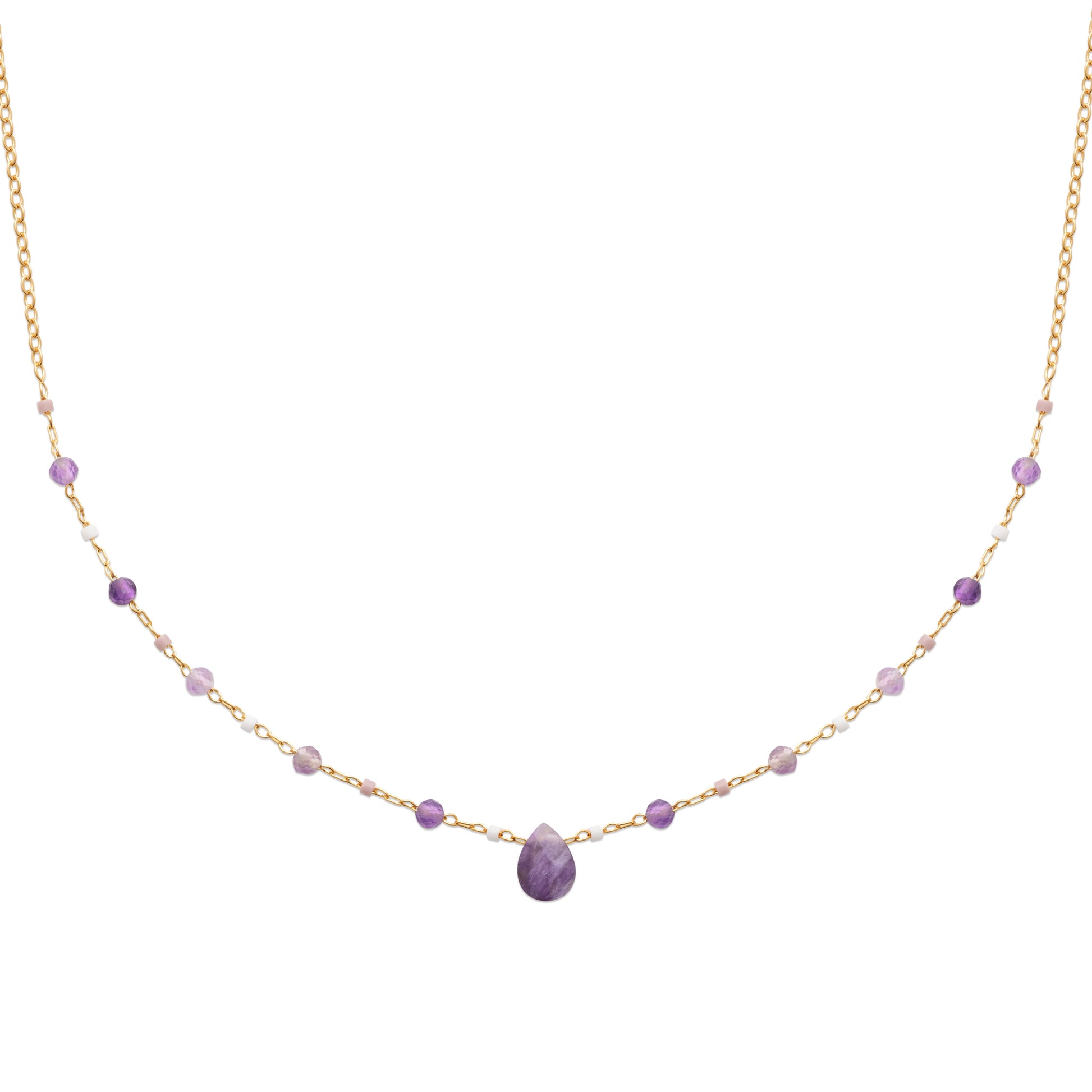 Фино колие с висулка от естествен аметист във форма на капка – деликатен акцент за всяка визия. Допълнено с лилави и светли мъниста върху позлатена верижка.