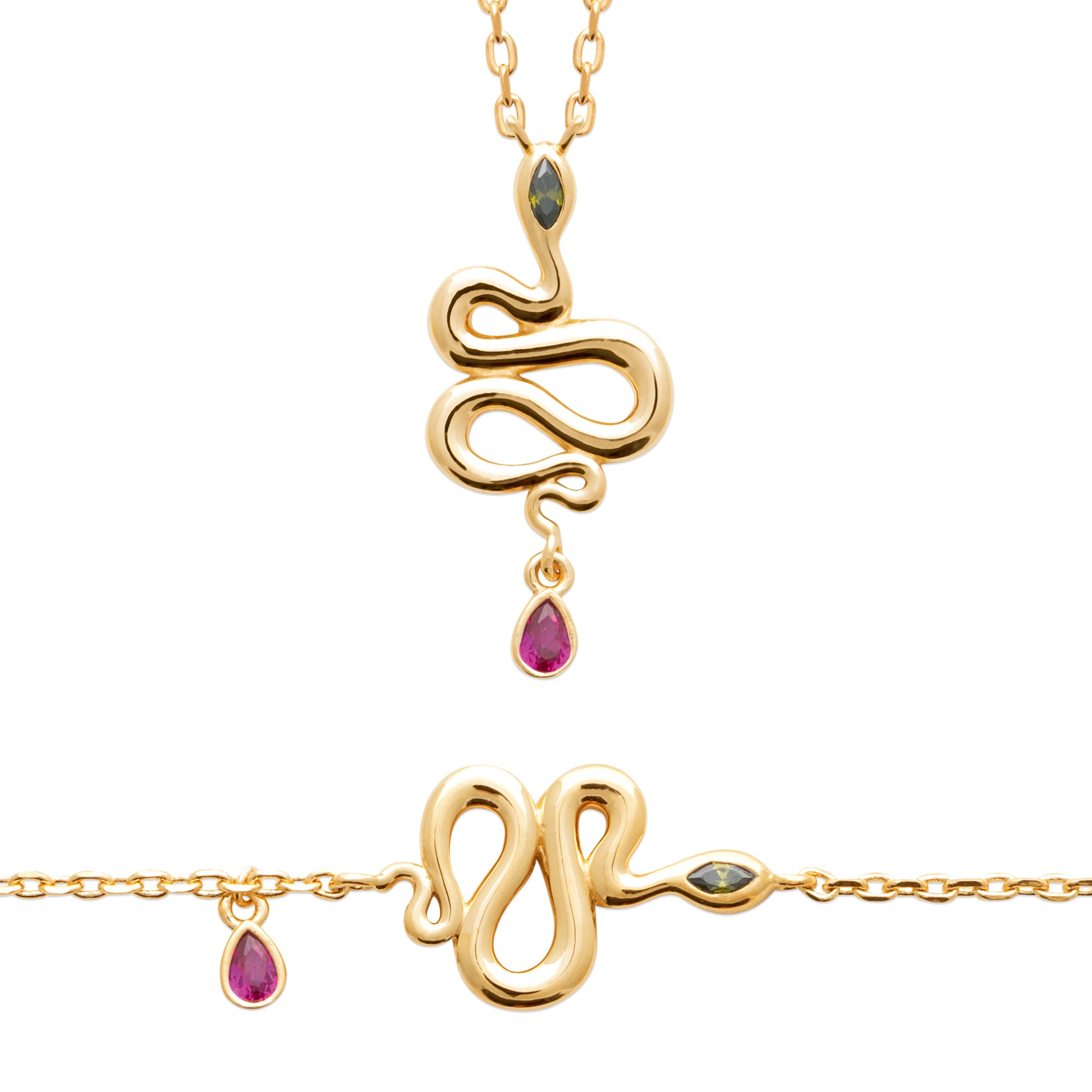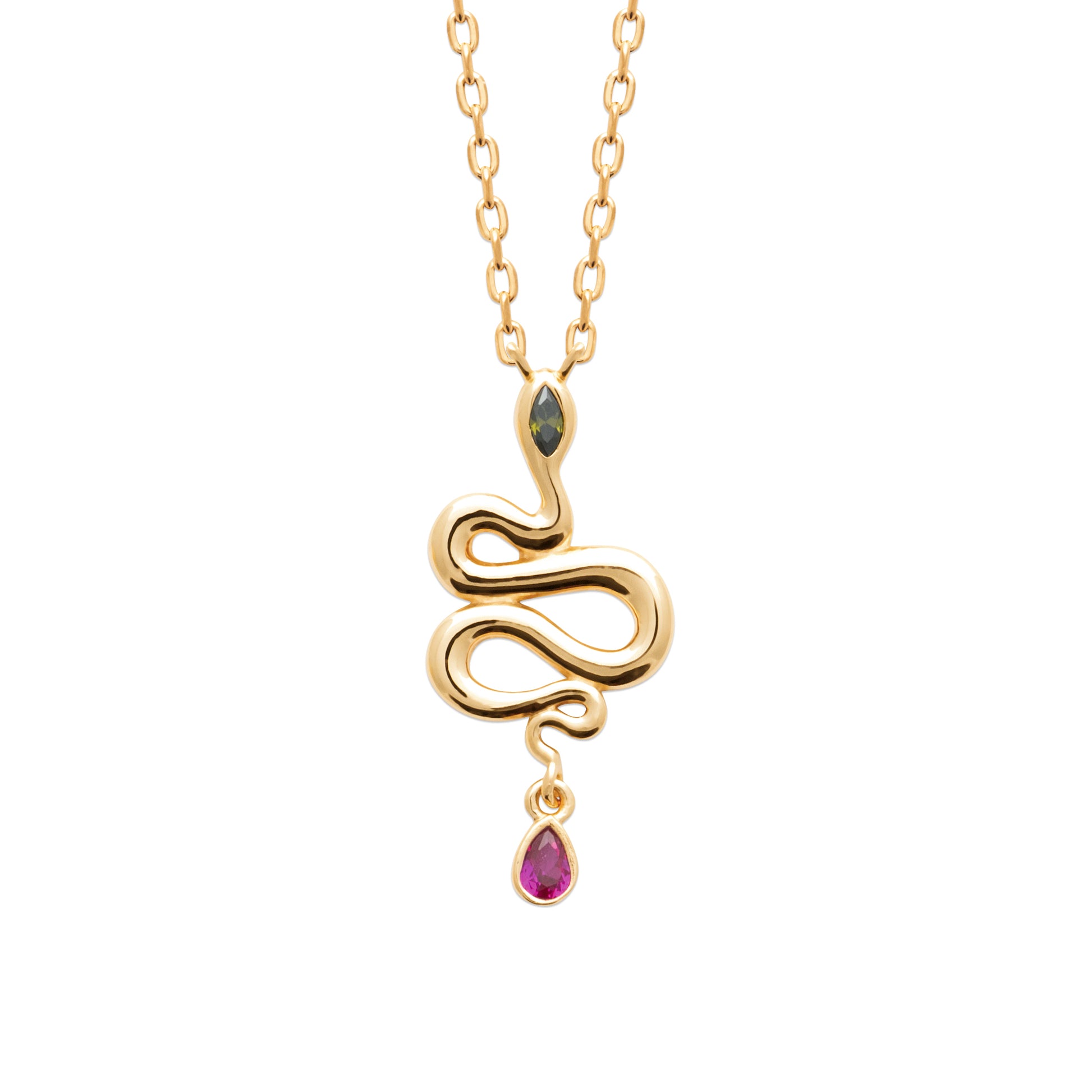 Това изящно колие с форма на змия е украсено с червен капковиден камък и блестящ детайл в горната част. Символ на сила и трансформация, това бижу подчертава индивидуалността и елегантността.