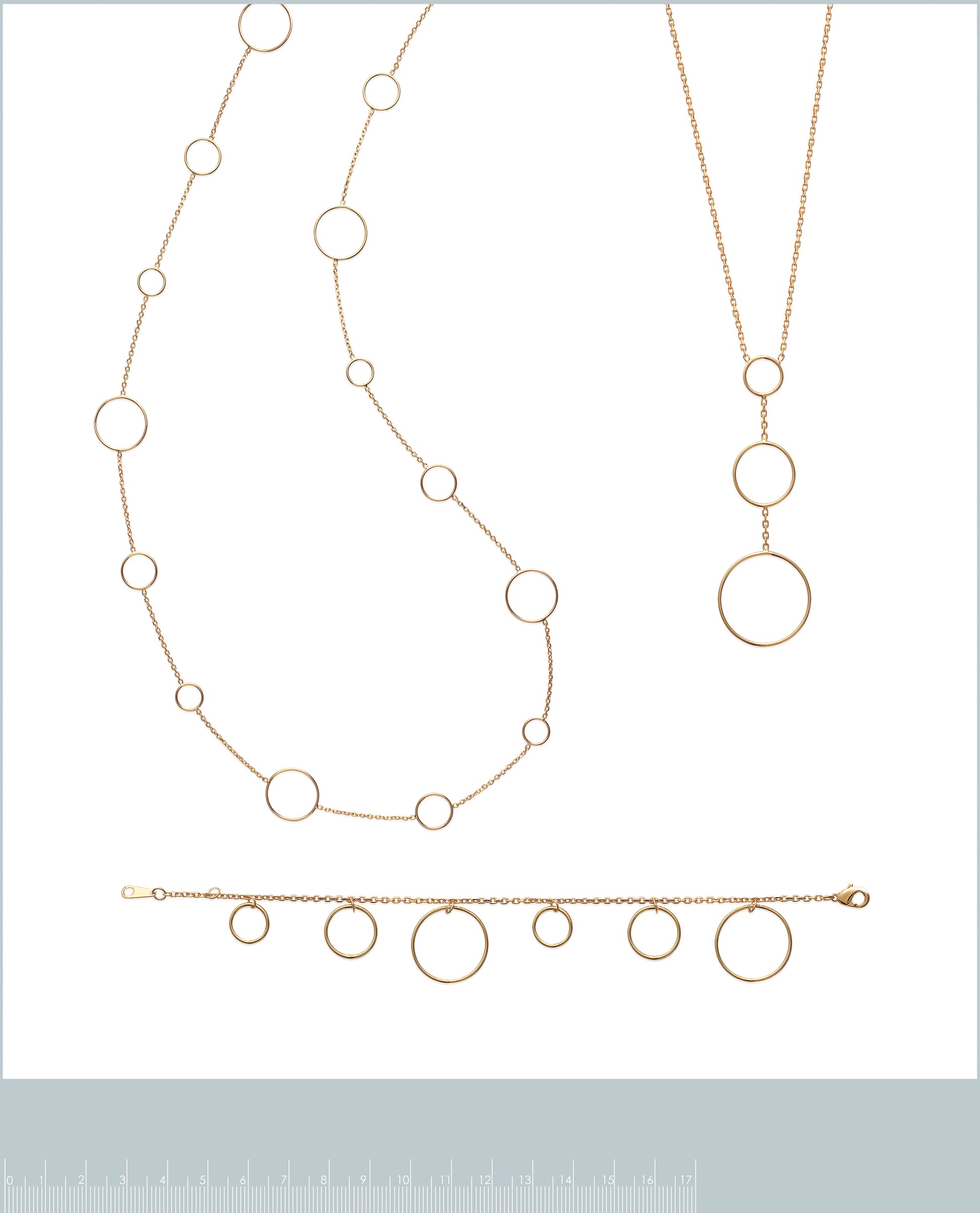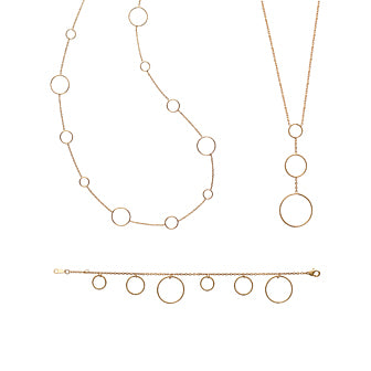 Този модерен комплект включва колие и гривна с различни по размер халки, които създават изчистена и елегантна визия. Идеален избор за жени, които харесват стил с характер.
